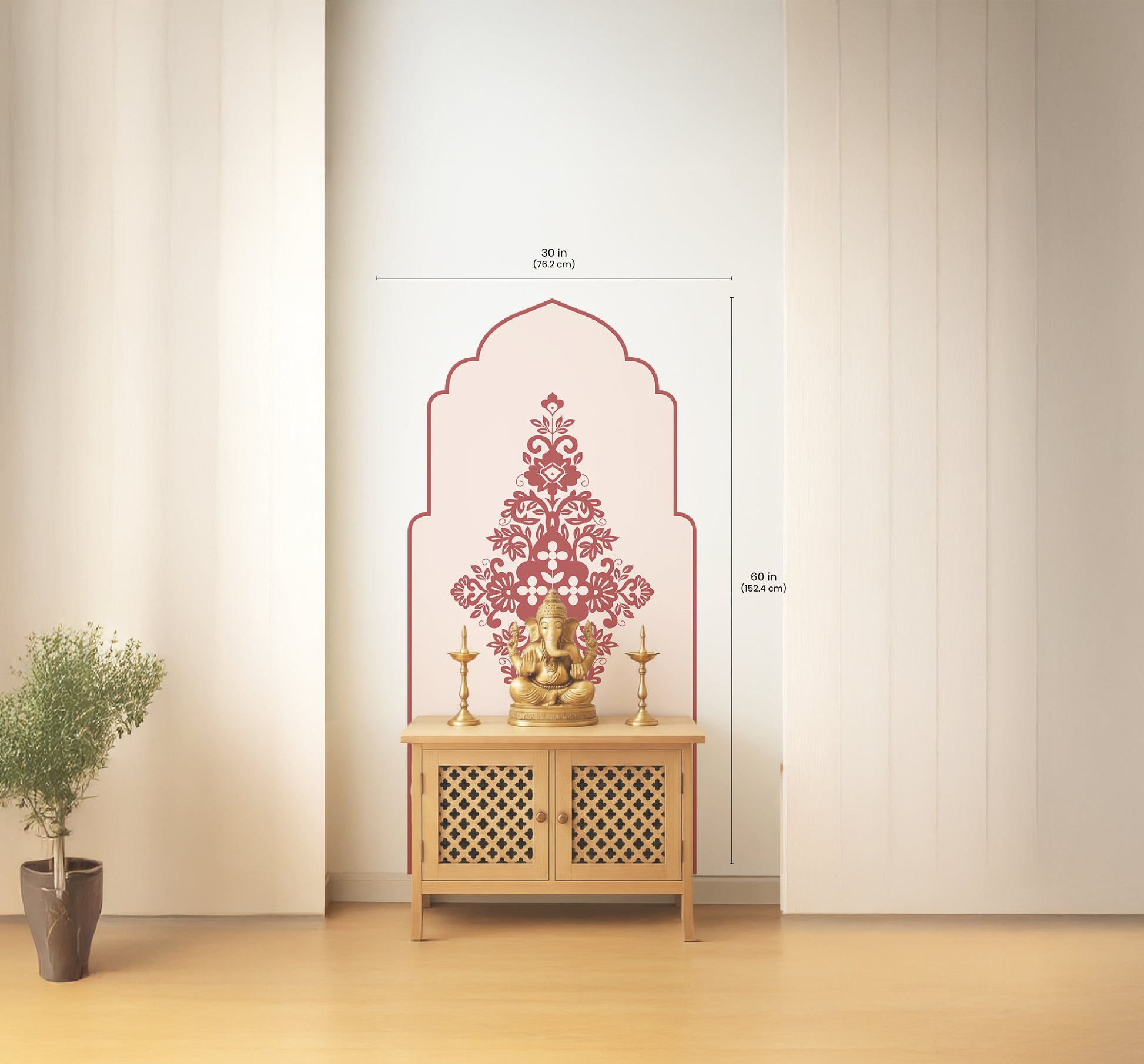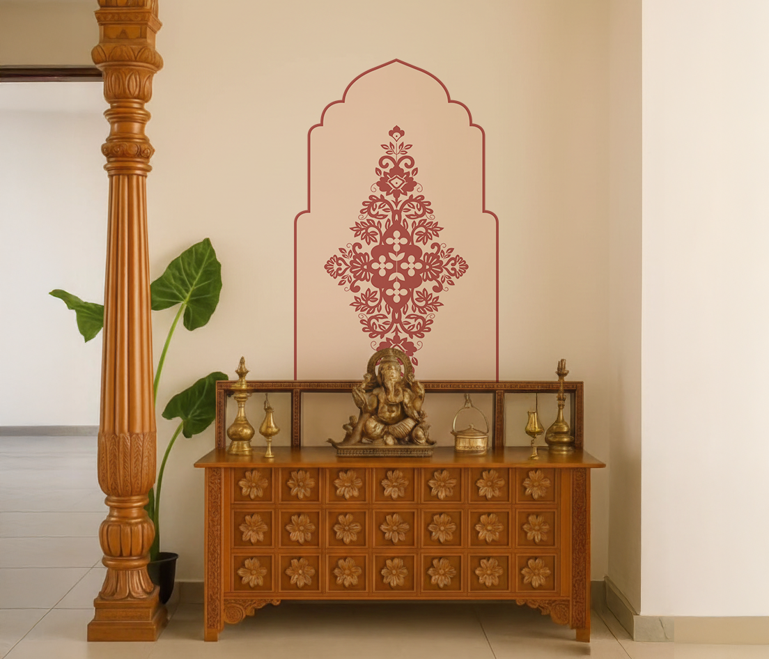 This wall decal creates a calm and dignified focal point for your pooja space or meditation corner, blending traditional Indian motifs with a clean, contemporary arch form. Designed to sit beautifully behind idols or consoles, it adds depth and symmetry while keeping the space visually light.