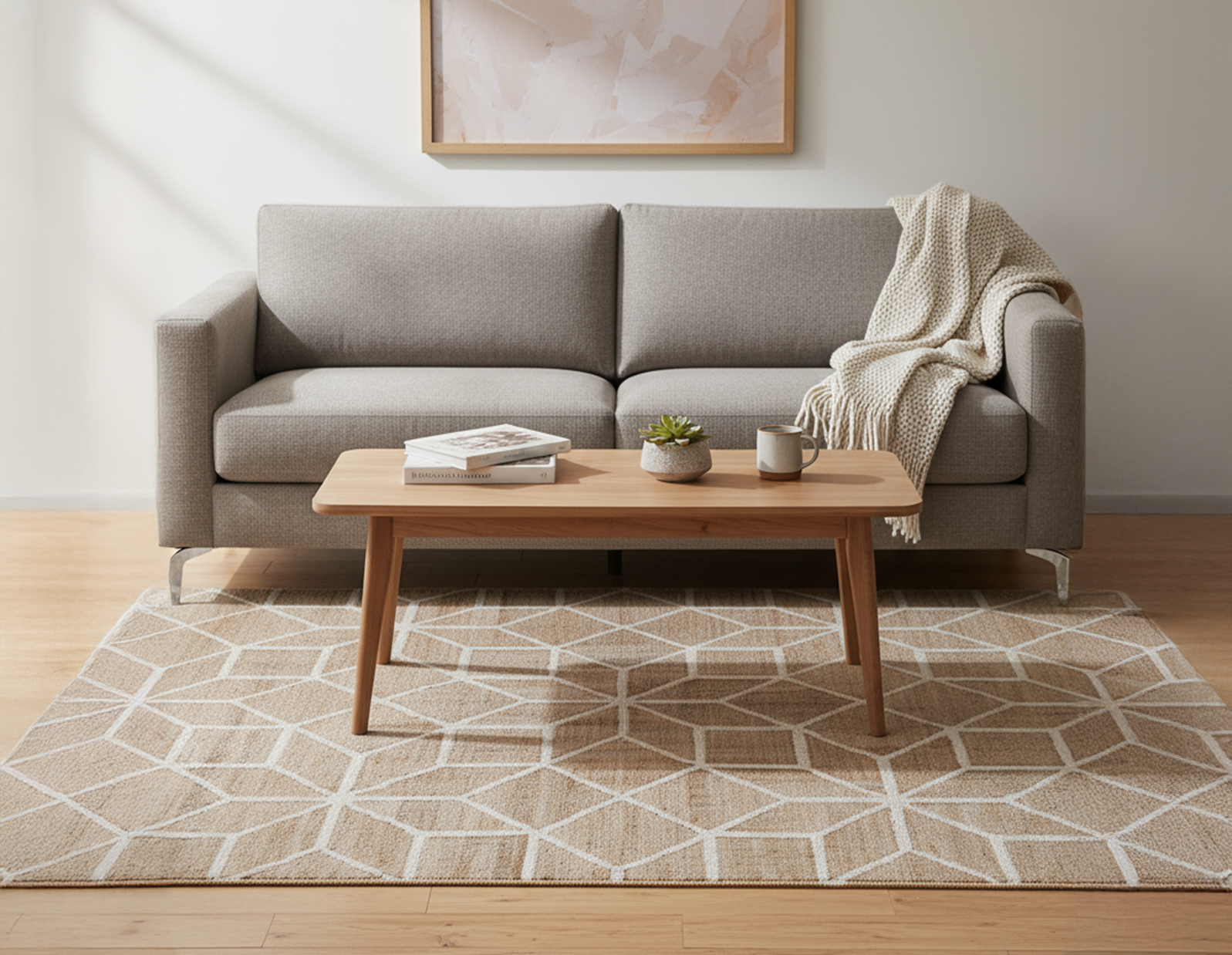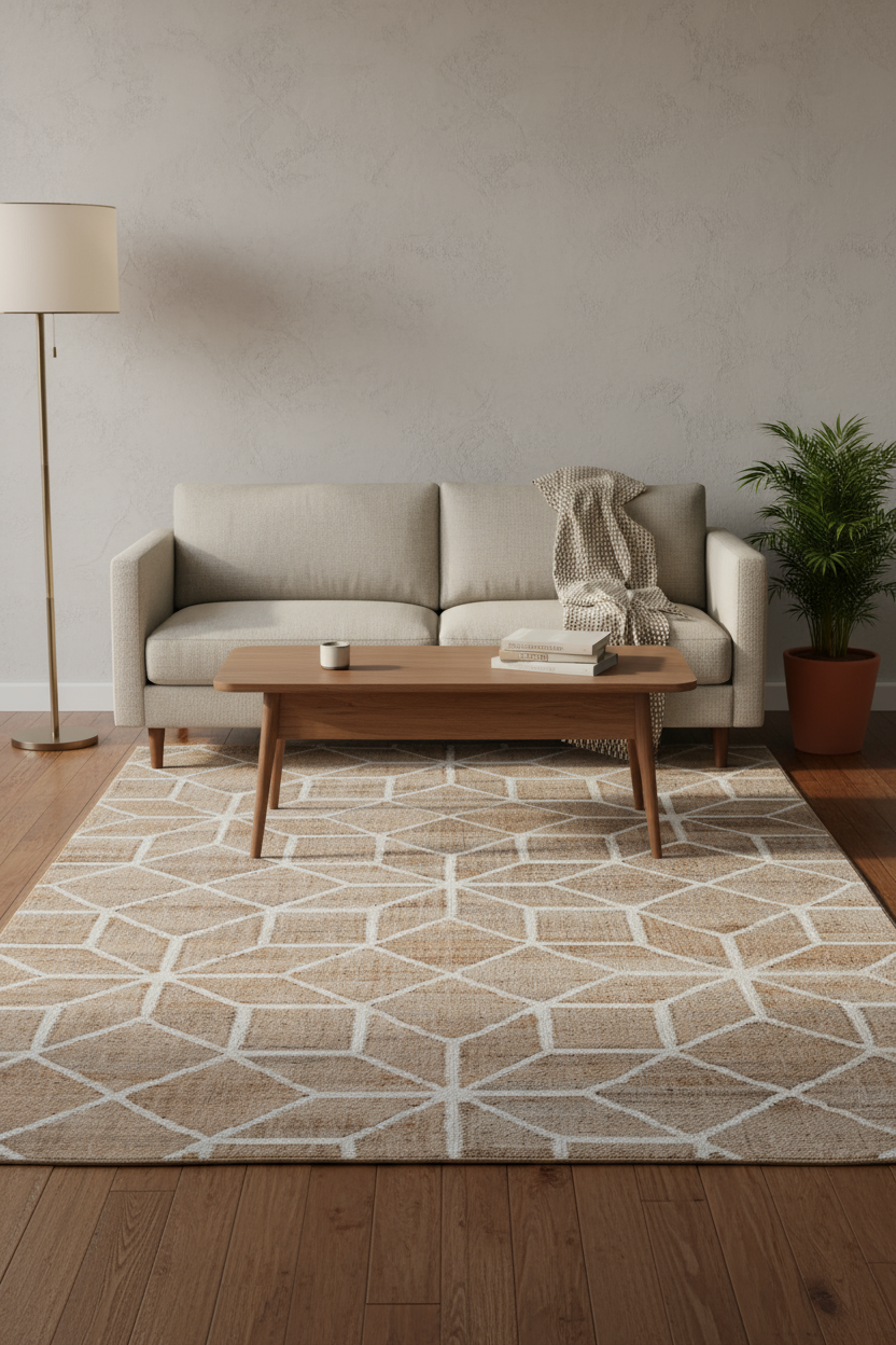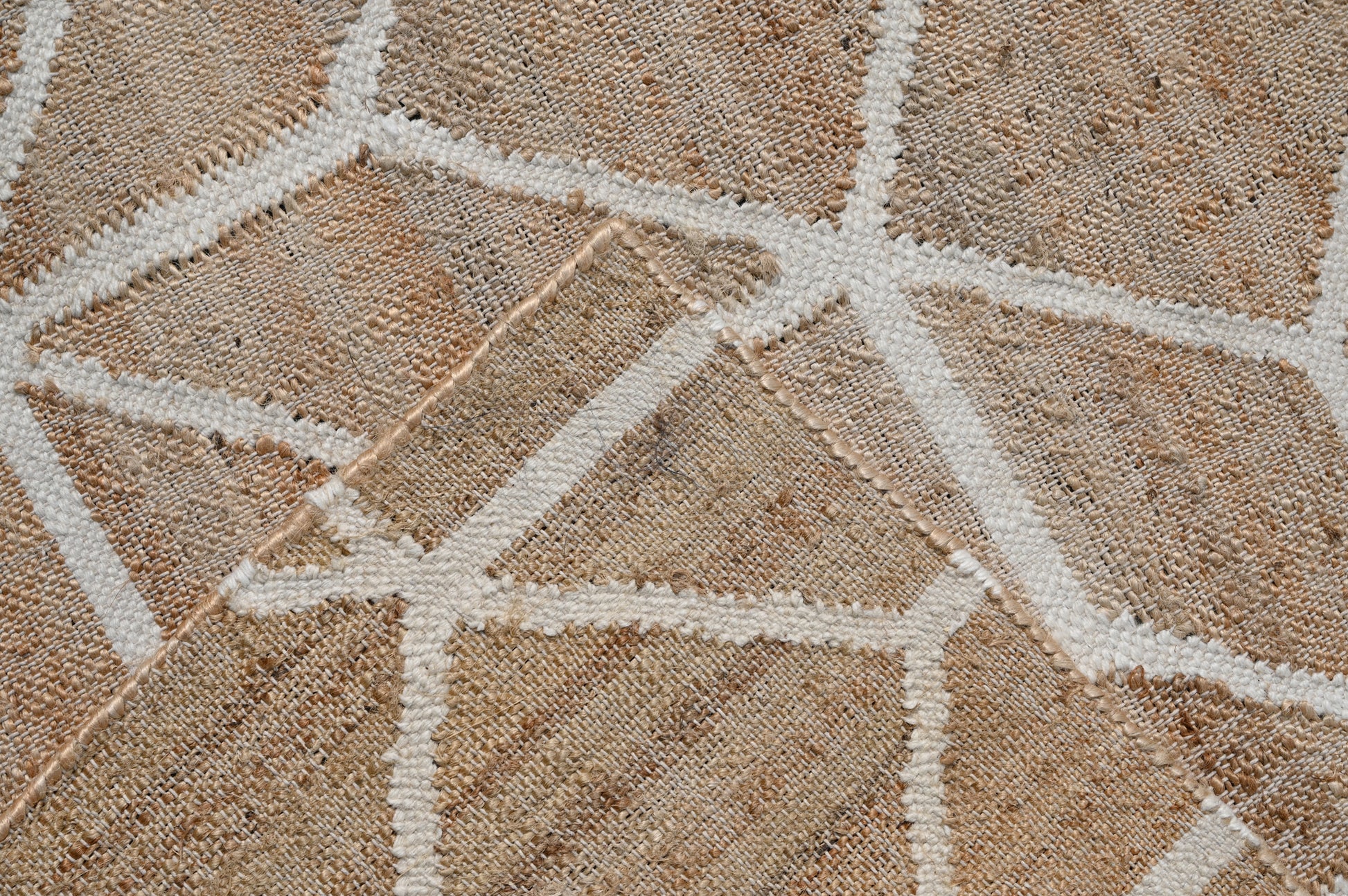 This rug highlights a contemporary geometric pattern in warm beige tones, accented with crisp white lines for a striking contrast. Handwoven with a natural blend of jute and viscose, it combines the earthy durability of jute with the soft sheen of viscose, making it both practical and stylish. Its modern design and neutral palette make it a versatile piece for living rooms, bedrooms, or lounge areas, adding texture and sophistication to any interior.