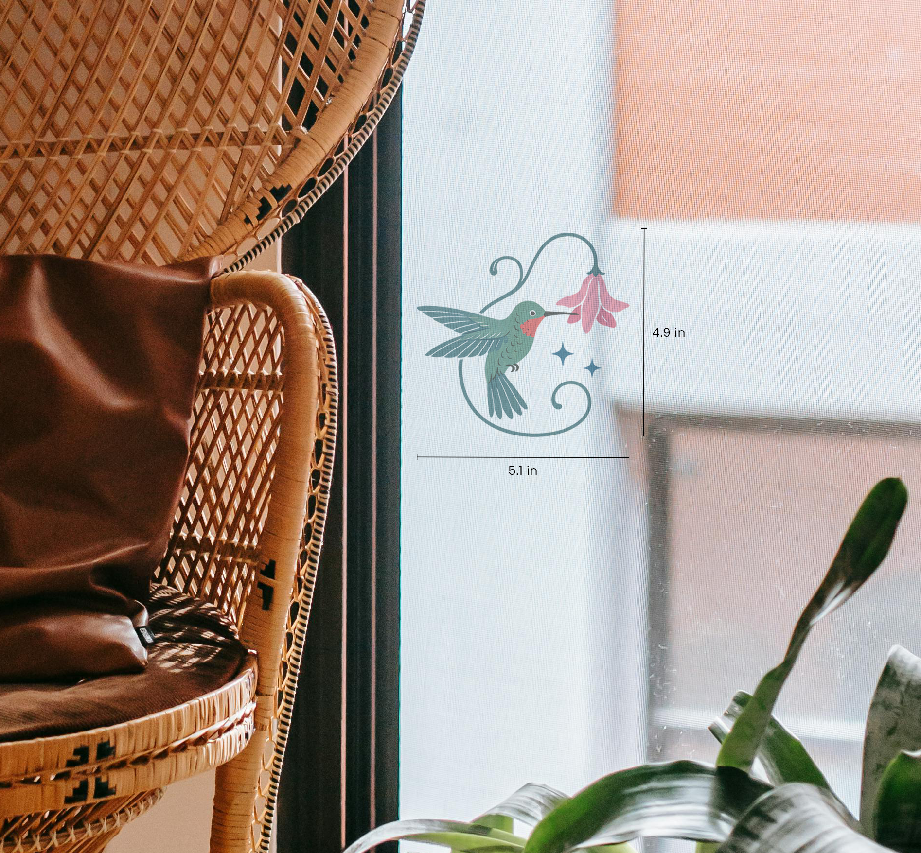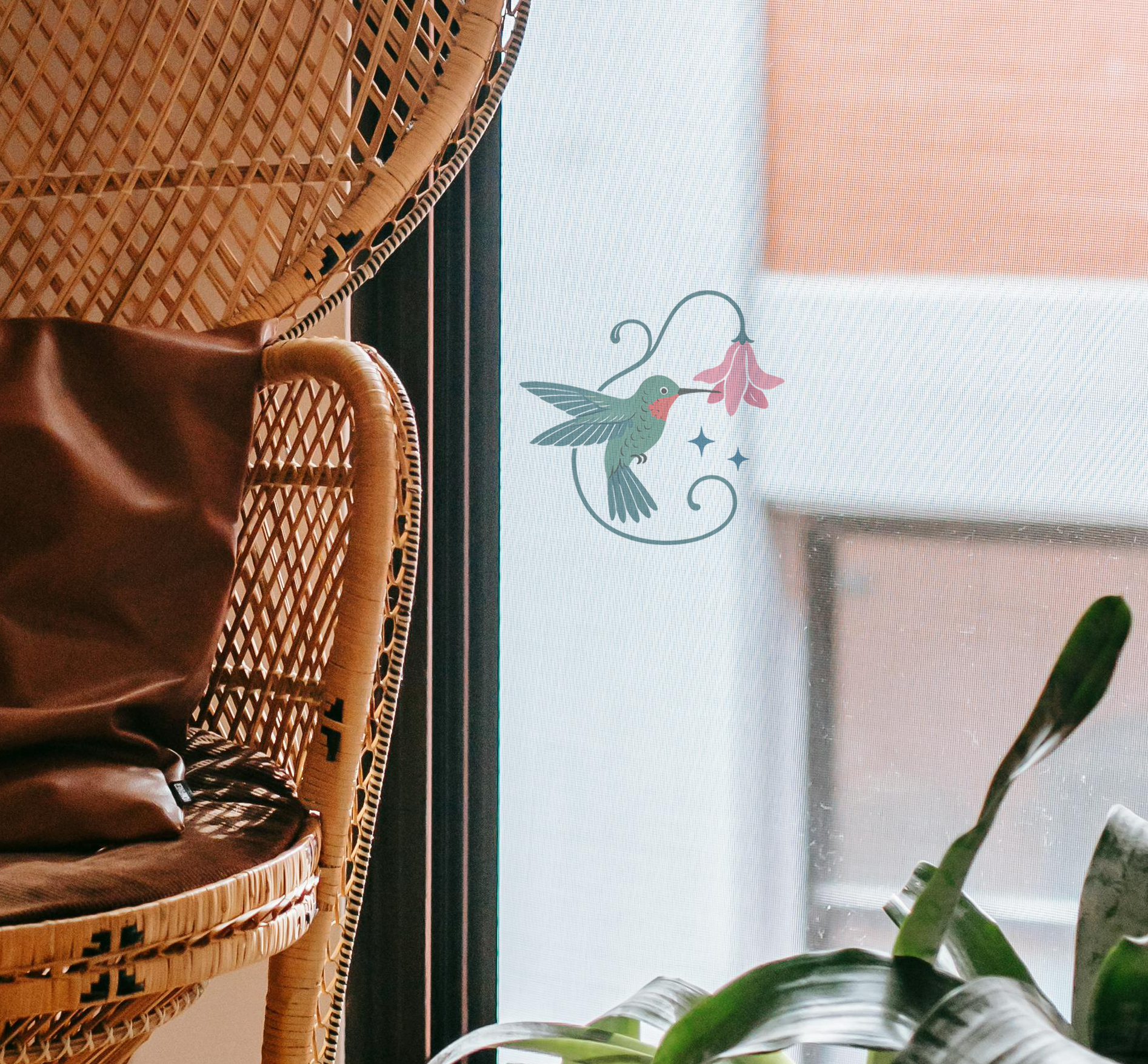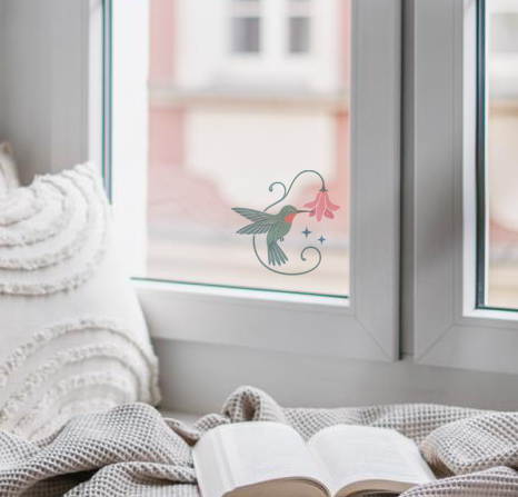 This charming glass decal, Humming Grace, captures the delicate beauty of a hummingbird in mid-flight, sipping nectar from a soft pink blossom. The graceful curves of the stem and the serene teal, green, and coral tones give it a whimsical, airy feel, accented by three tiny sparkling star motifs. Perfect for adding a lively yet elegant touch to glass doors, windows, or partitions, this design brings a refreshing, bohemian vibe and a connection to nature into any space.
