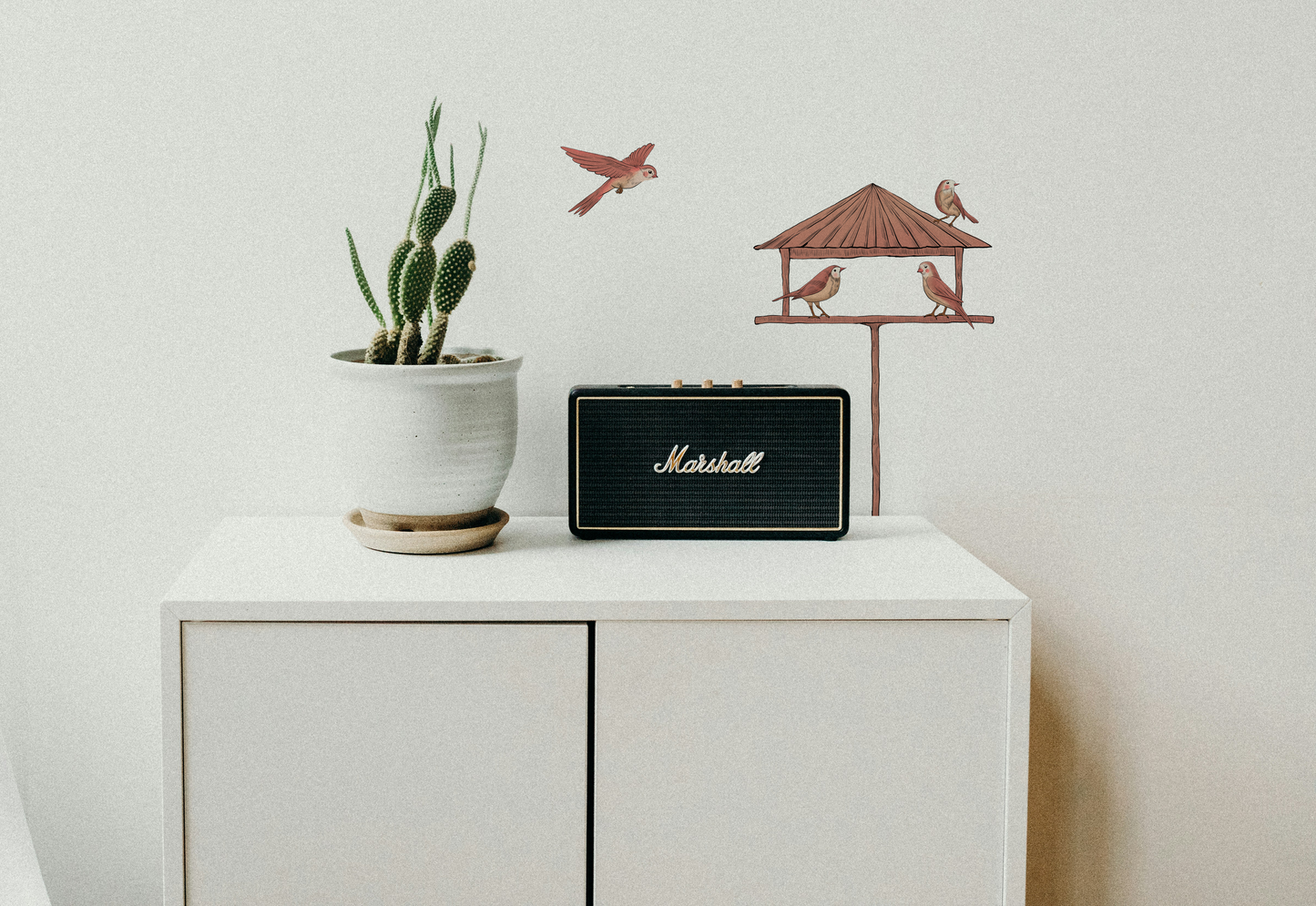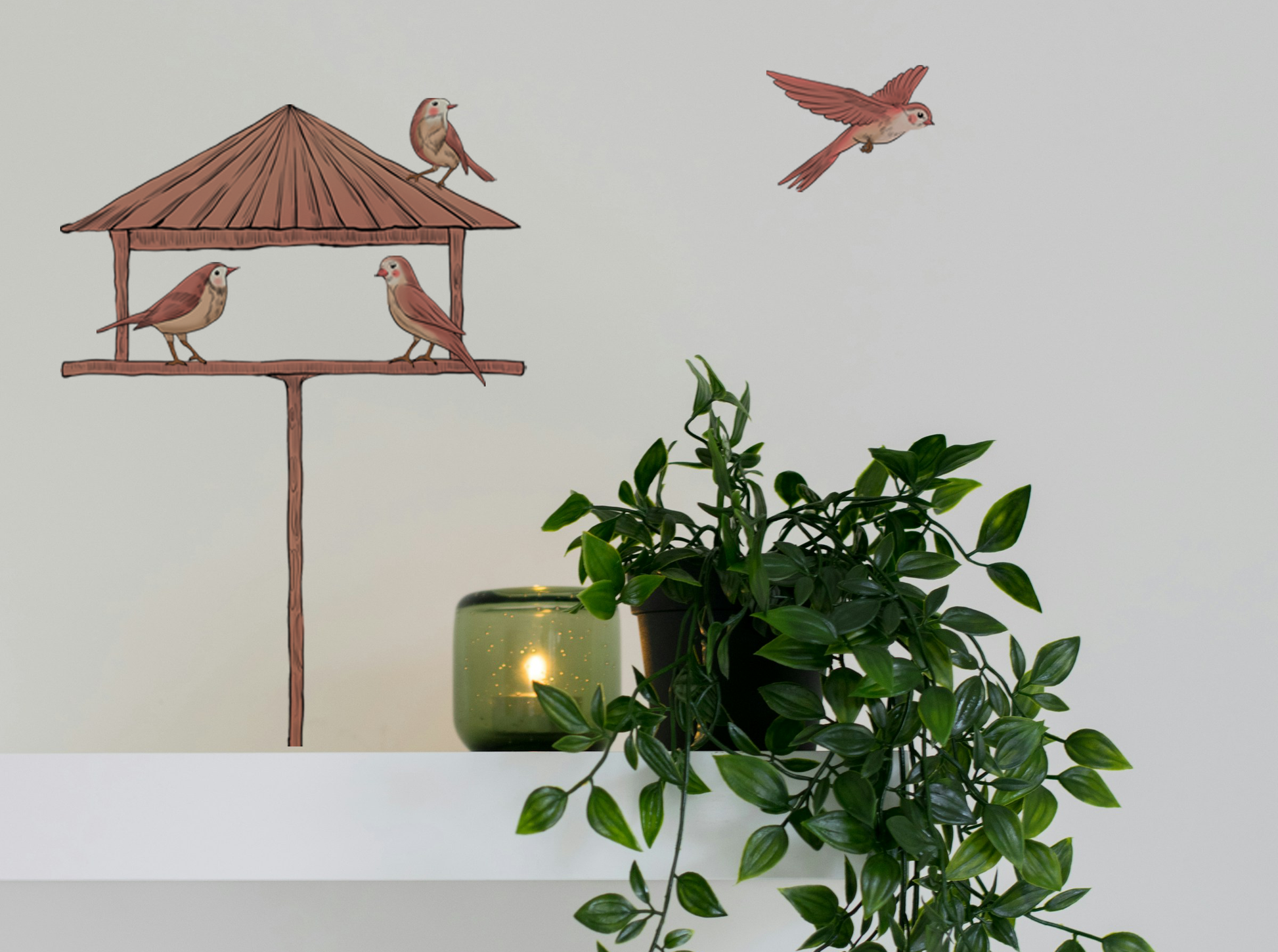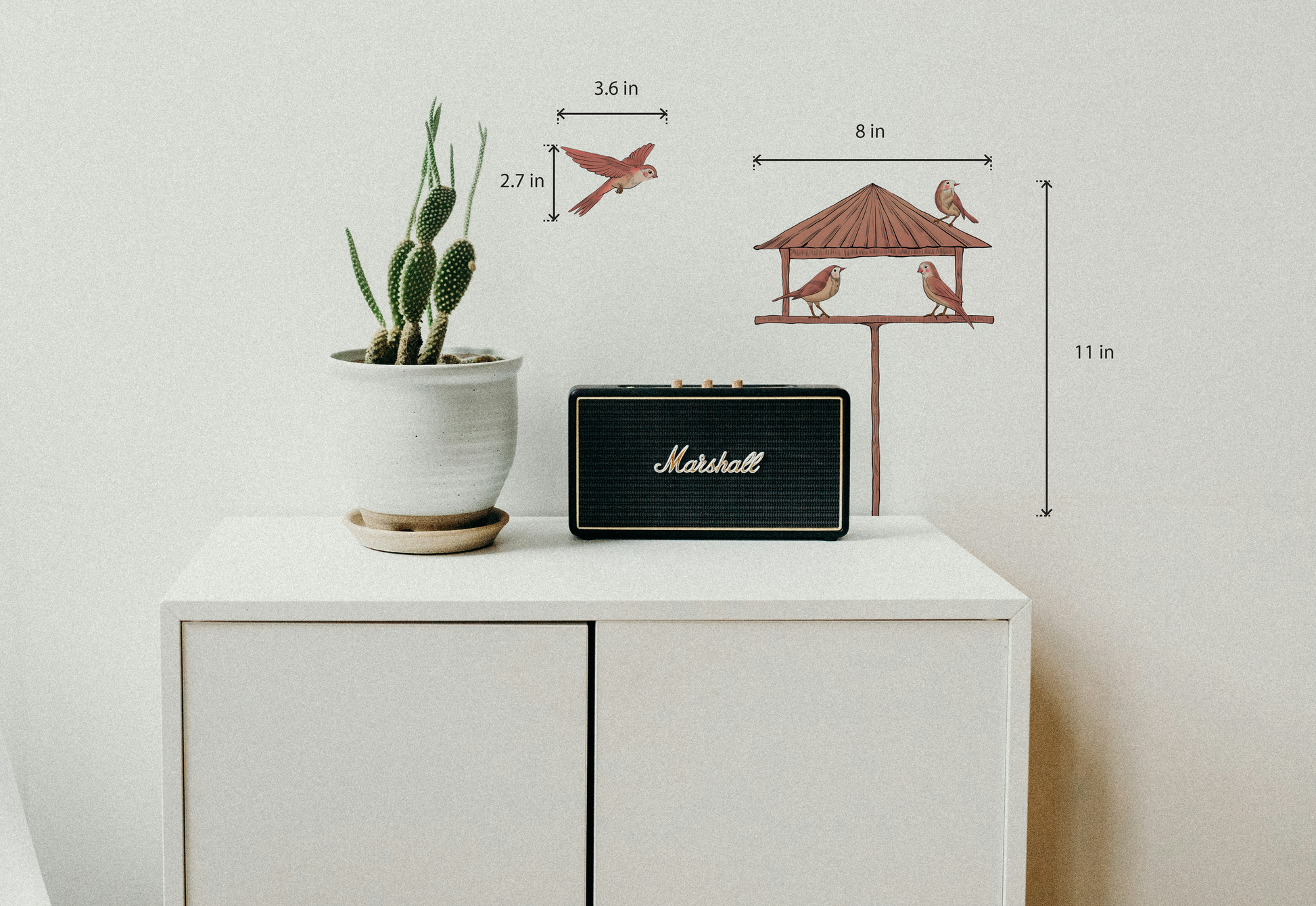 This birdhouse-themed decal captures a heartwarming scene of nature, bringing a peaceful yet playful touch to any space. The charming wooden birdhouse is carefully detailed to create a cozy and inviting feel. Inside, two birds are perched comfortably, appearing to rest or interact, symbolizing togetherness and warmth. A third bird is sitting on the roof of the birdhouse. Outside, a fourth bird is in mid-flight, its wings spread wide as it gracefully approaches the house, adding a dynamic sense of movement. The positioning of the birds creates the impression that they are peacefully engaging with one another, evoking a scene of freedom, companionship, and the simple joys of nature. This beautifully detailed decal blends artistic elegance with a nature-inspired aesthetic, making it an ideal choice for adding a serene yet cheerful touch to any space.