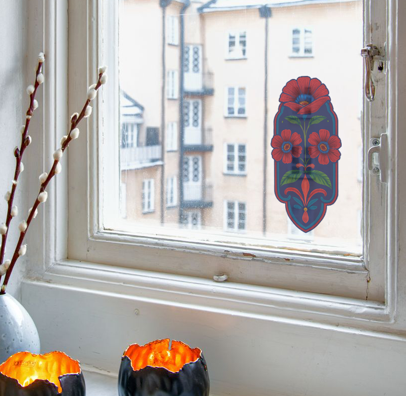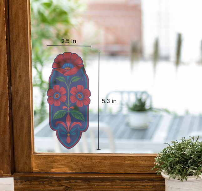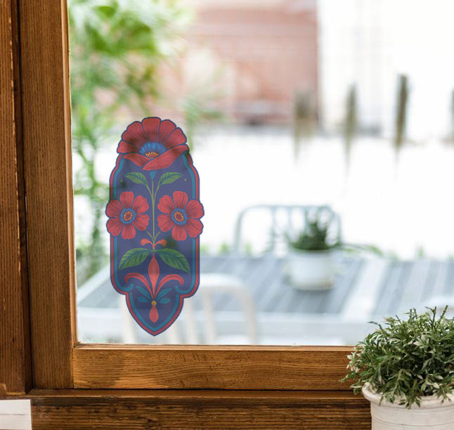 This exquisite glass decal showcases a bold, artistic floral motif inspired by traditional Indian craftsmanship. Vibrant red blossoms with intricate blue and gold centers bloom gracefully against a deep navy backdrop, framed by a striking ornamental arch. The lush green leaves and elegant detailing evoke a regal yet lively mood, perfect for adding sophistication and a touch of cultural charm to any glass door, window, or partition. The rich colors and hand-painted effect bring warmth and timeless elegance to modern or traditional spaces alike.