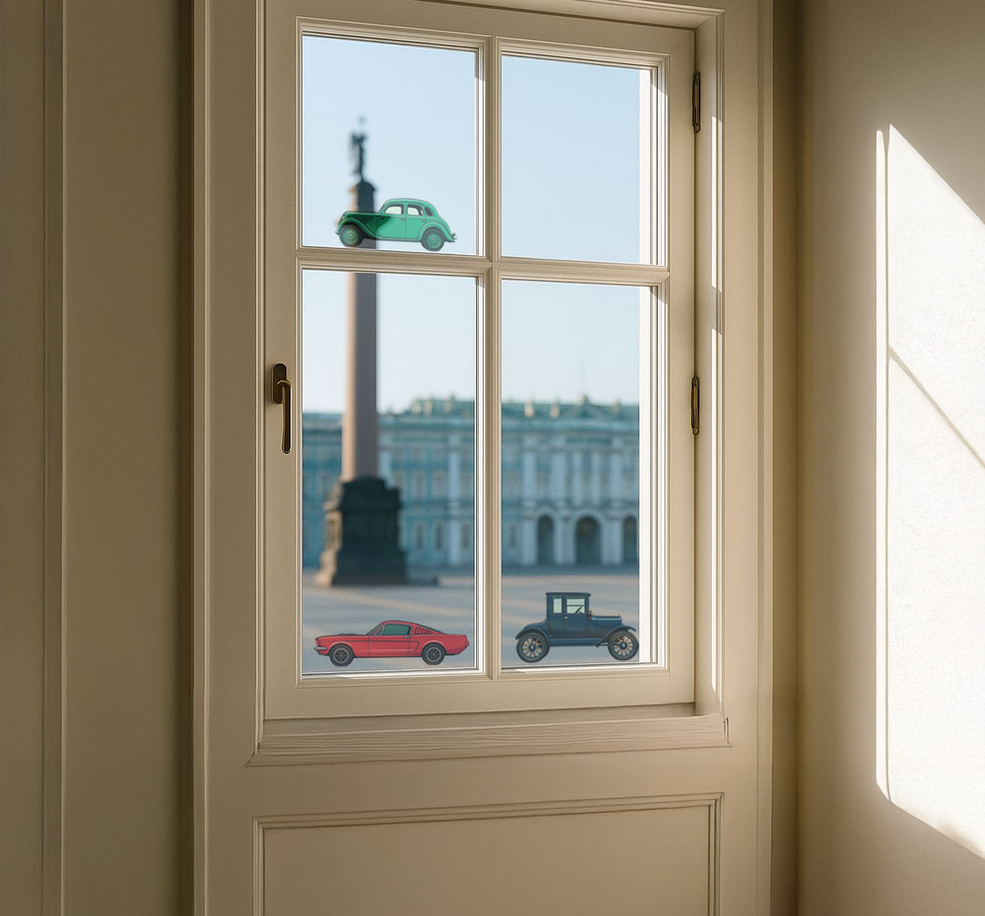 This charming glass decal set, Retro Rides, features three iconic cars rendered in rich, vintage hues — a fiery red muscle car, a classic green sedan, and a deep blue antique coupe. Together, they celebrate automotive history, combining sleek curves, timeless details, and nostalgic elegance. Perfect for adding character and motion to glass doors, windows, or partitions, this set brings a bold, dynamic vibe and retro sophistication to any space.