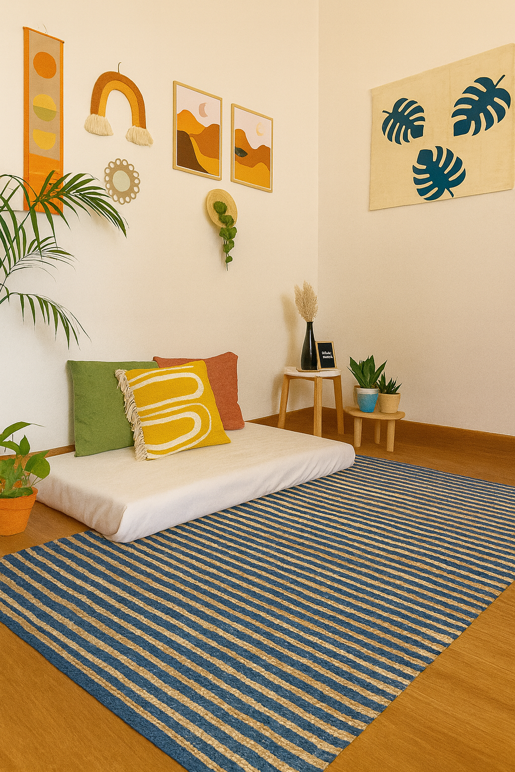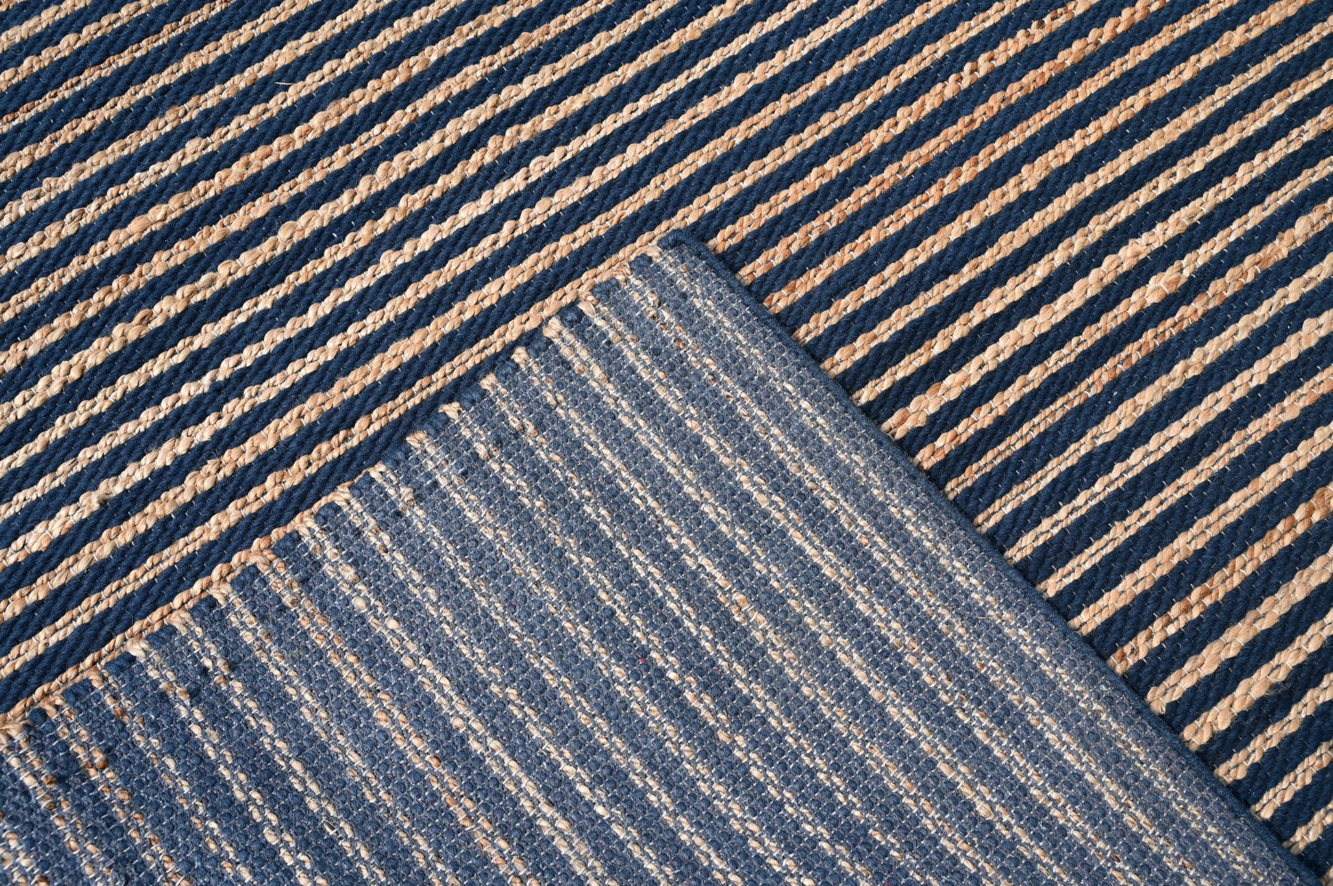 This striped rug combines earthy beige with deep blue, creating a balanced design that’s both bold and versatile. Handwoven from a blend of jute and wool, it merges natural strength with soft texture, making it suitable for both casual and modern interiors. With a medium thickness and durable build, it’s perfect for living rooms, bedrooms, or entryways where style meets practicality.