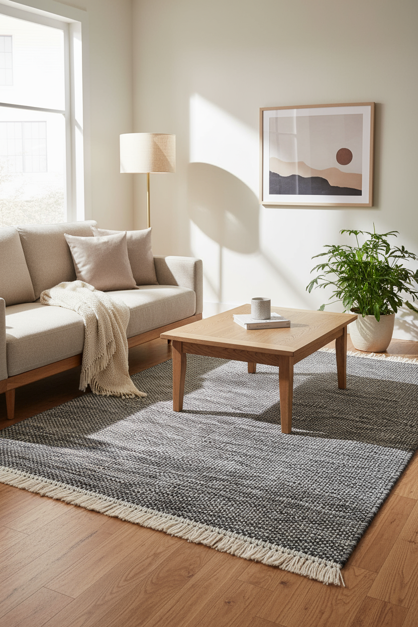 This handwoven flatweave rug combines timeless craftsmanship with modern simplicity. Made from 100% New Zealand wool, it offers natural softness, warmth, and resilience. The subtle grey-black tonal weave is versatile, blending effortlessly into contemporary or classic interiors. Finished with delicate fringes on the edges, it adds a touch of understated elegance, perfect for living rooms, bedrooms, or study corners.