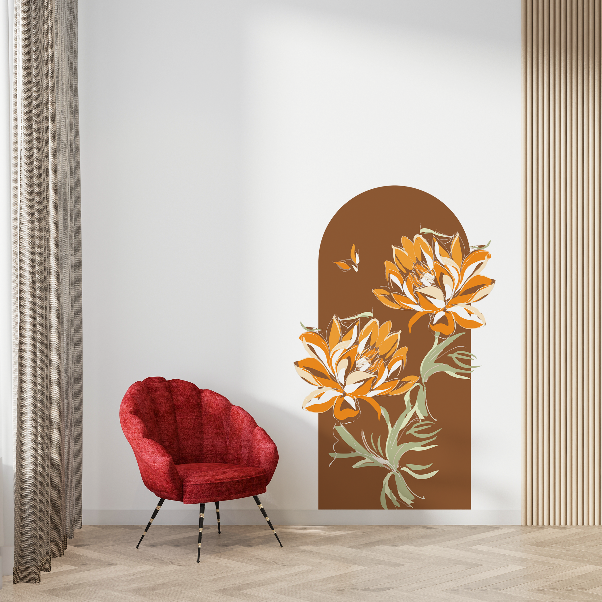 This wall decal features a bold arched form layered with stylised floral artwork in warm, earthy tones, creating wall decor that feels modern yet inviting. Designed to work as wall stickers for home, it adds a strong visual focal point without overwhelming the space. The clean illustration style and balanced colours make it ideal for living rooms, reading corners, or bedrooms seeking wall stickers for home decoration with a refined look. Easy to apply and remove, this wall sticker blends seamlessly into contemporary interiors while offering a softer alternative to framed art.
