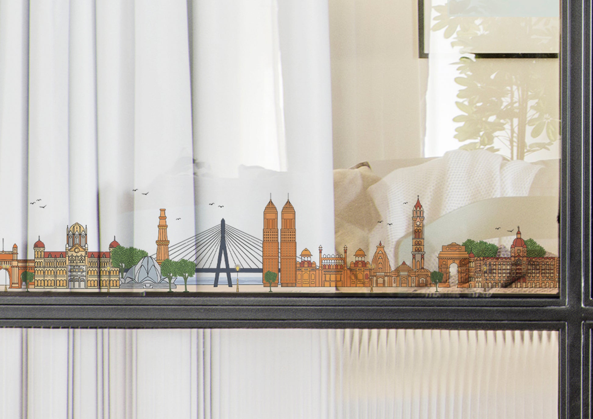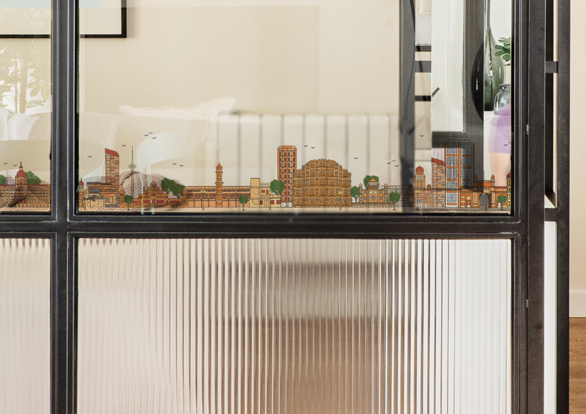 Experience a panoramic view with Urban Reflections — a striking design that captures the spirit of India’s most iconic cities. This vibrant, minimal illustration brings together the skylines of Delhi, Mumbai, and Jaipur in a seamless composition, beautifully interwoven with the historical buildings, monuments, and architectural details that define their unique character. From the majestic structures of Delhi, to the bustling energy of Mumbai, and the regal charm of Jaipur, every element tells a story of heritage and modernity coexisting. Urban Reflections offers the diverse urban landscape of India, celebrating its rich history and dynamic present on a transparent canvas.